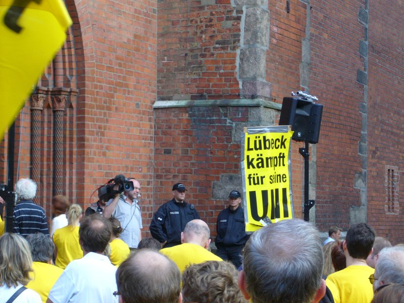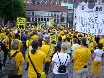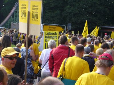 Fotos vom Sternmarsch „Lübeck kämpft“ am 1. Juli 2010 in Lübeck mit anschließender Kundgebung auf dem Rathausmarkt zum Erhalt der Uni Lübeck.